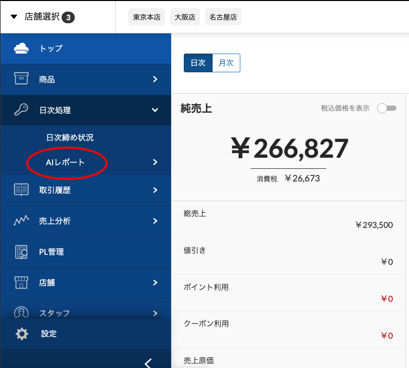 ①専用タブで操作に迷わない『スマレジ』のサイドメニュー上に「AIレポート」の専用タブを設置し、画面上で迷うことなく操作できるようになりました。