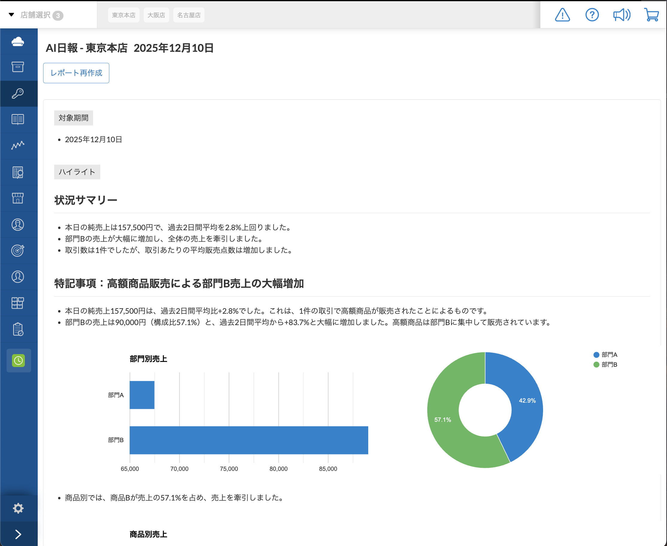 例)選択可能な項目 できること 売上種別 総売上/純売上/純売上(税抜) 選択した値をベースとしたレポートを作成できます。 内容レベル 概要/基本/標準/詳細/専門家 AIへの指示文を希望の粒度で設定できます。 出力項目 売上/部門別売上/時間帯別売上/同曜売上/顧客単価/顧客数/会計数/会計あたりの購買点数/会計あたりの商品単価/担当者別/商品別売上/グループコード別売上/ABC分析 レポートに含める項目・含めない項目を指定し、