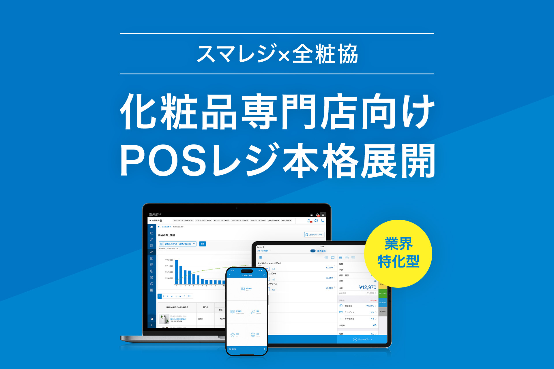 iPadなどのタブレットを利用したクラウドPOSレジ『スマレジ』を展開する株式会社スマレジ(本社:大阪市中央区、代表取締役:宮﨑 龍平、以下「当社」)は、全国化粧品小売協同組合連合会(以下「全粧協」)と代理店契約を締結し、化粧品専門店向けにクラウドPOS『スマレジ』への移行を支援する取り組みを開始しました。